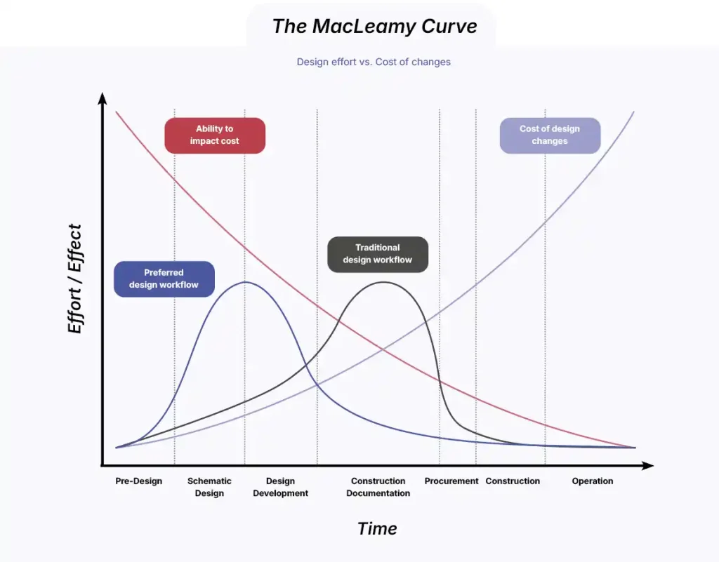 Front-loading (bringing decision-making and analysis earlier into design) has long been known as a solution. The MacLeamy Curve diagram illustrates this well: the earlier a change is made, the cheaper and more impactful it is. But in practice, front-loading hasn’t scaled because it requires a level of coordination, information access, and expertise that traditional tools simply can’t support.